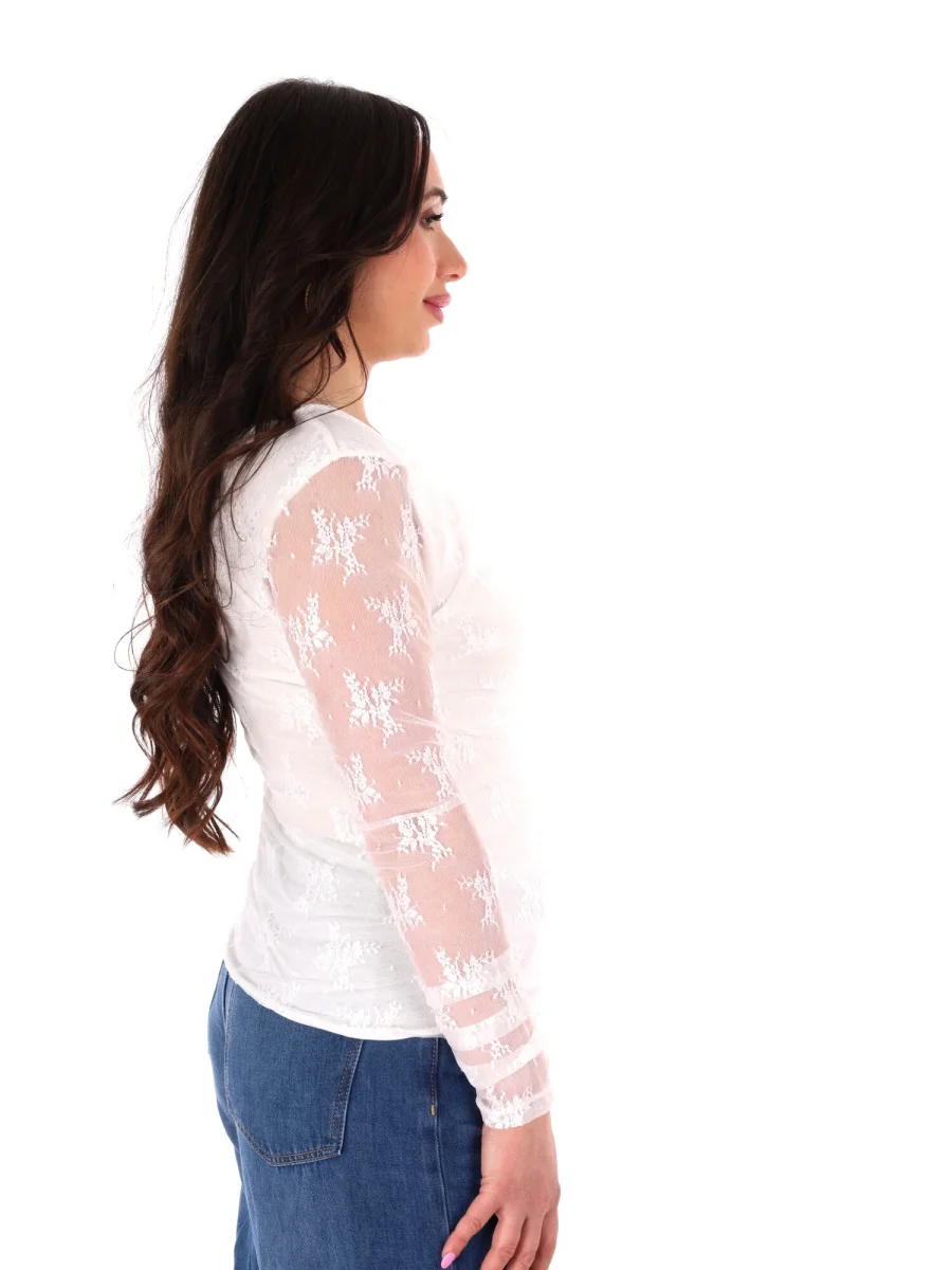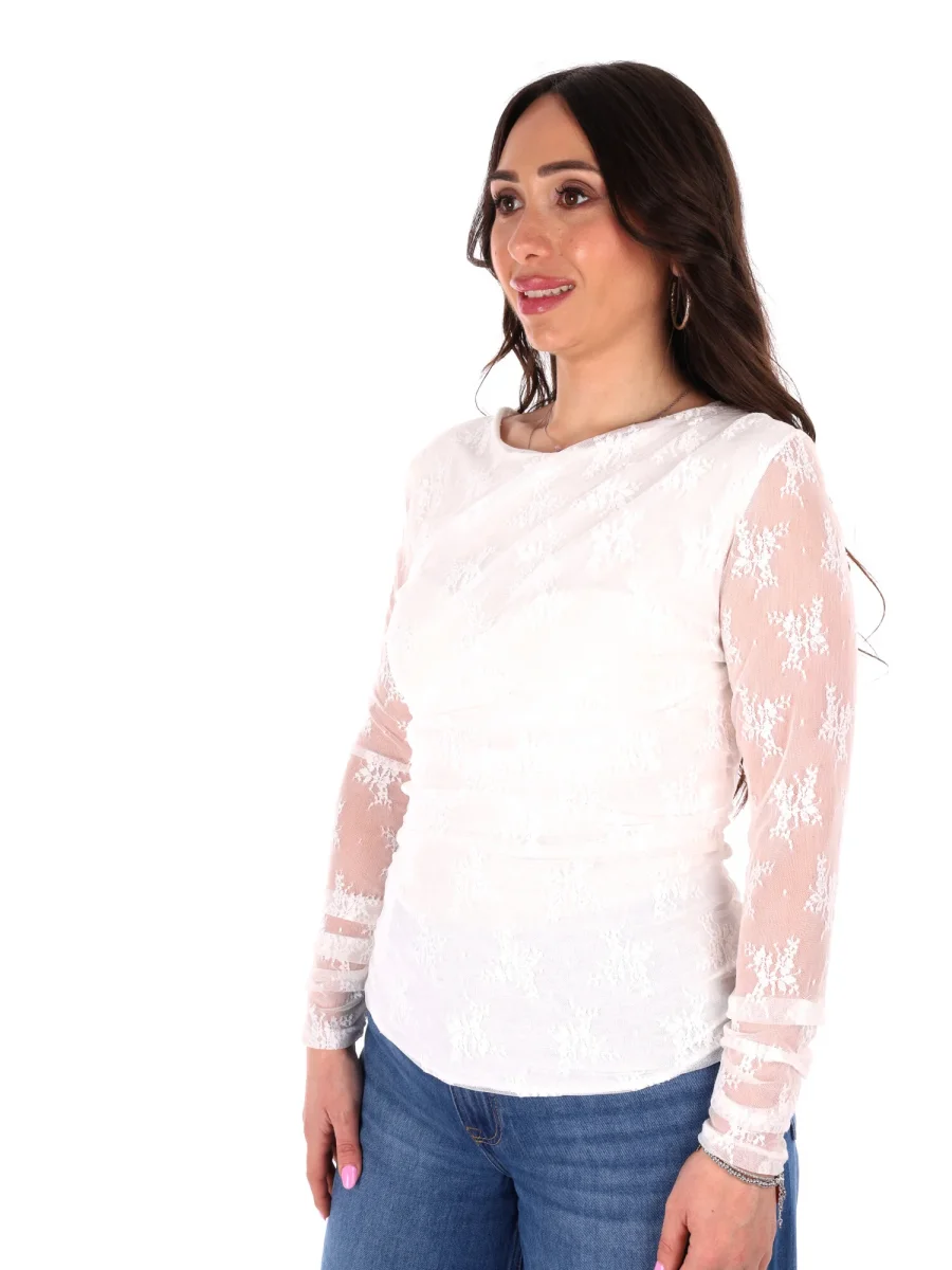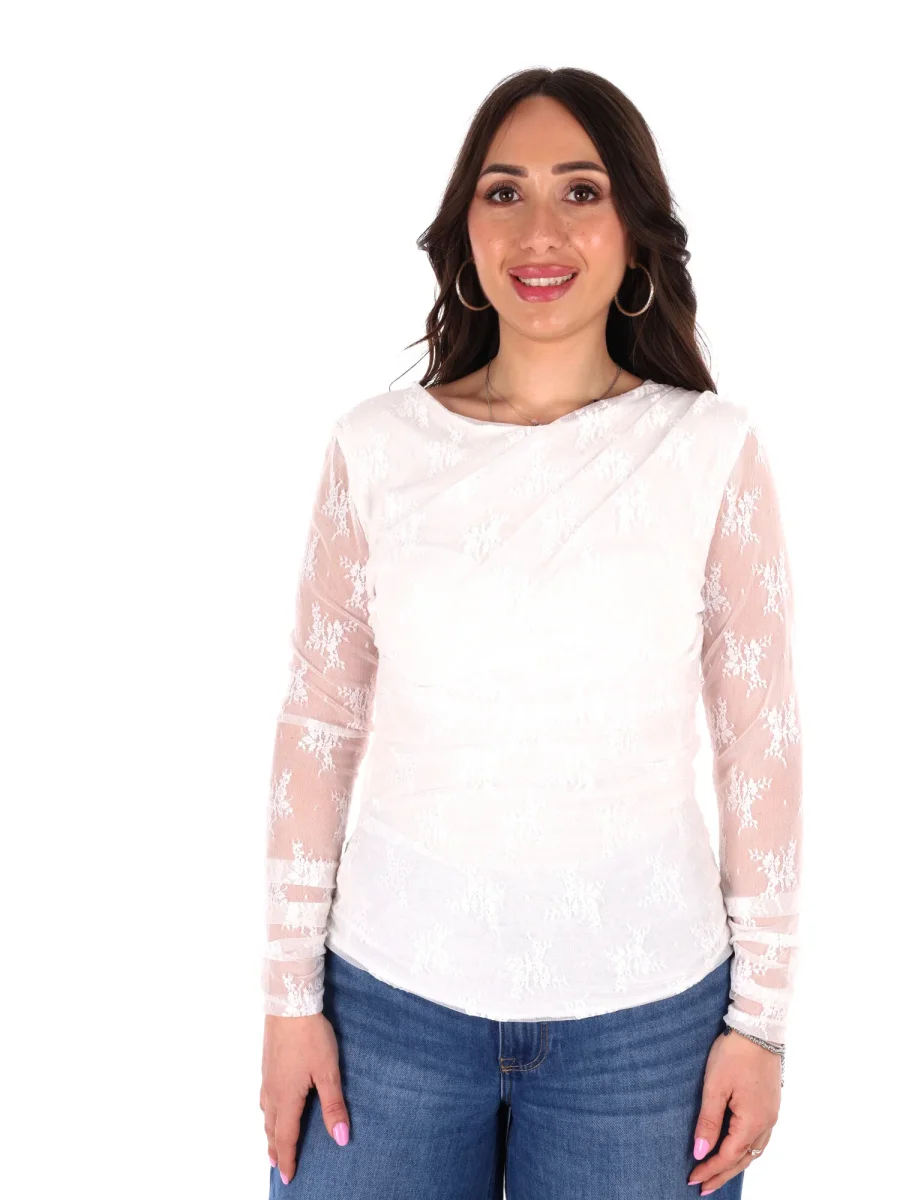 T-shirt a manica lunga da donna firmata Miss Love, protagonista della nuova collezione Primavera/Estate, interamente realizzata in delicato pizzo per un effetto sofisticato e femminile. Il collo arrotondato regala un tocco classico e versatile, mentre il drappeggio sul davanti aggiunge movimento e profondità, creando un dettaglio elegante che valorizza la silhouette.