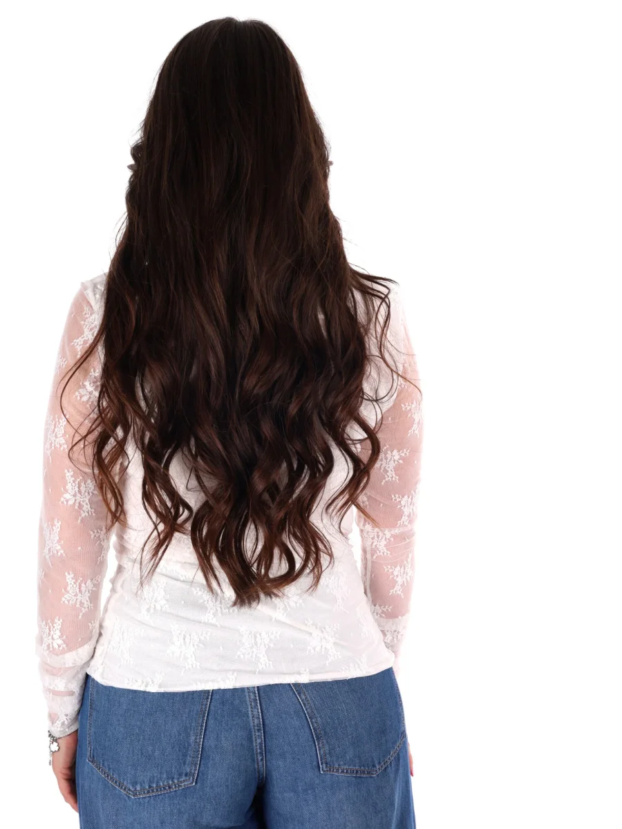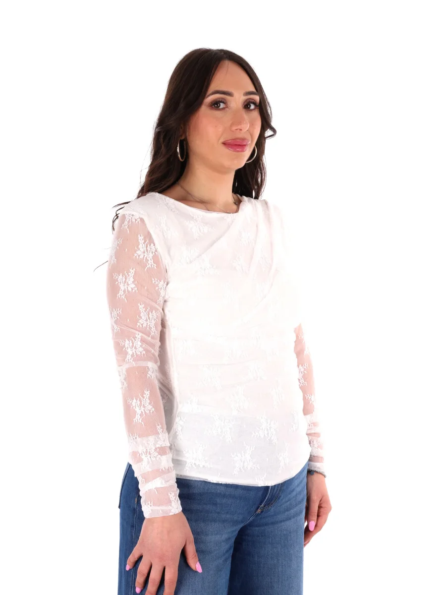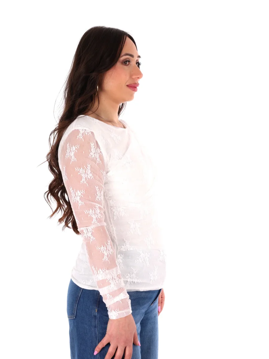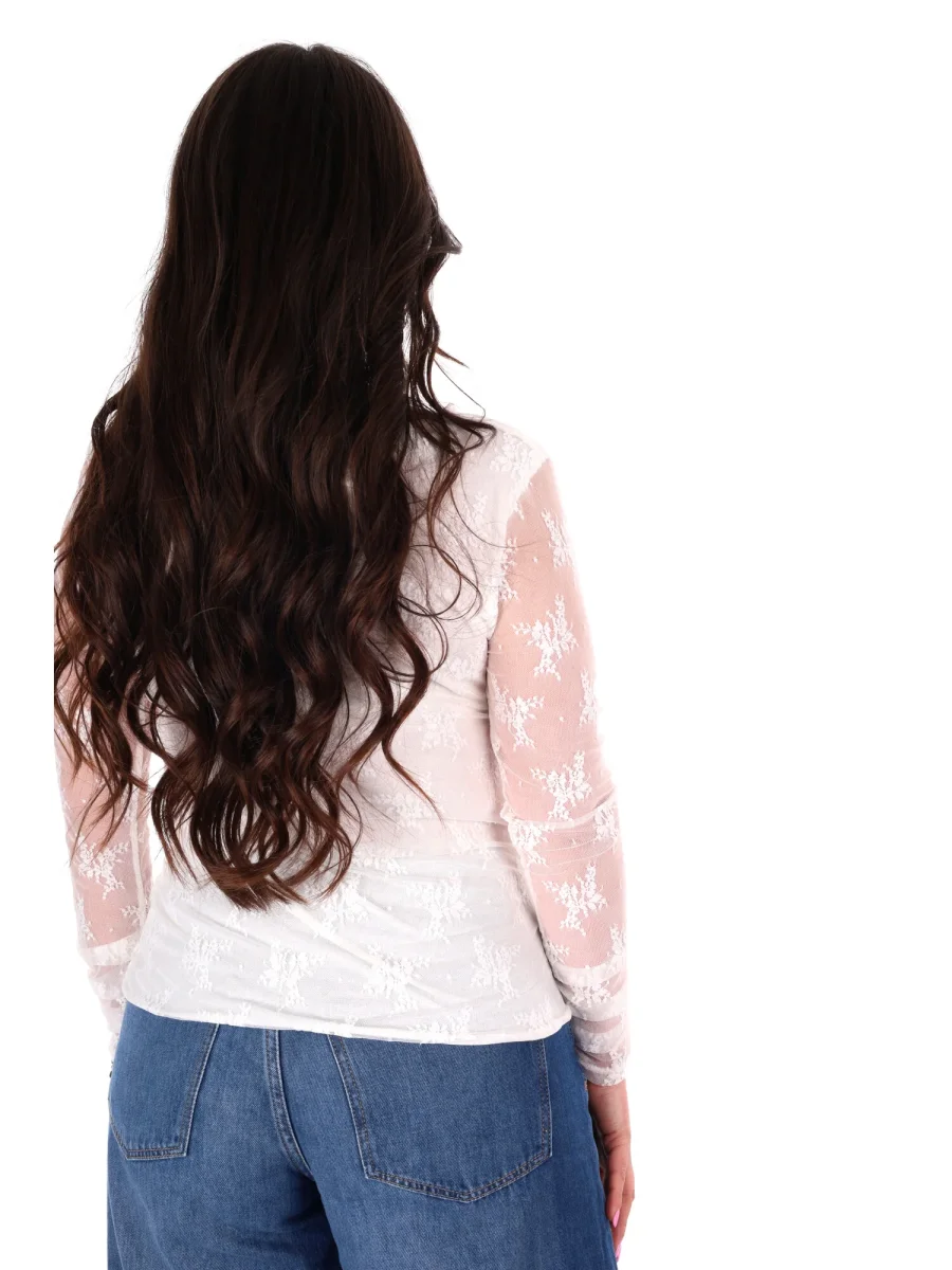 T-shirt a manica lunga da donna firmata Miss Love, protagonista della nuova collezione Primavera/Estate, interamente realizzata in delicato pizzo per un effetto sofisticato e femminile. Il collo arrotondato regala un tocco classico e versatile, mentre il drappeggio sul davanti aggiunge movimento e profondità, creando un dettaglio elegante che valorizza la silhouette.