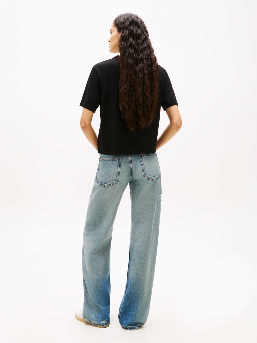La T-shirt Tommy Jeans a maniche corte dal taglio boxy è pensata per offrire comfort quotidiano e uno stile casual distintivo.