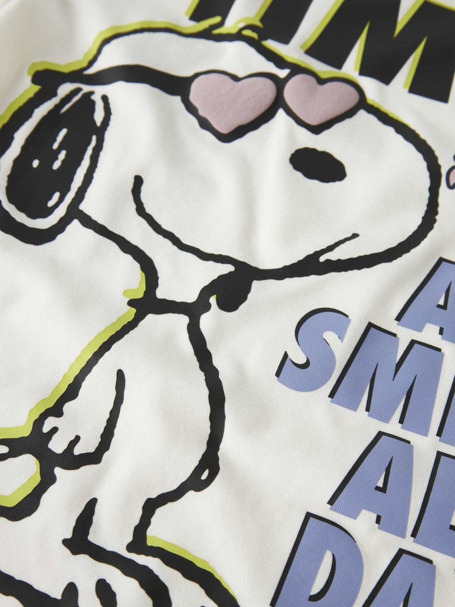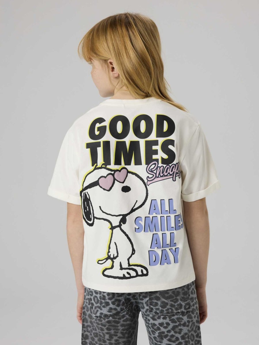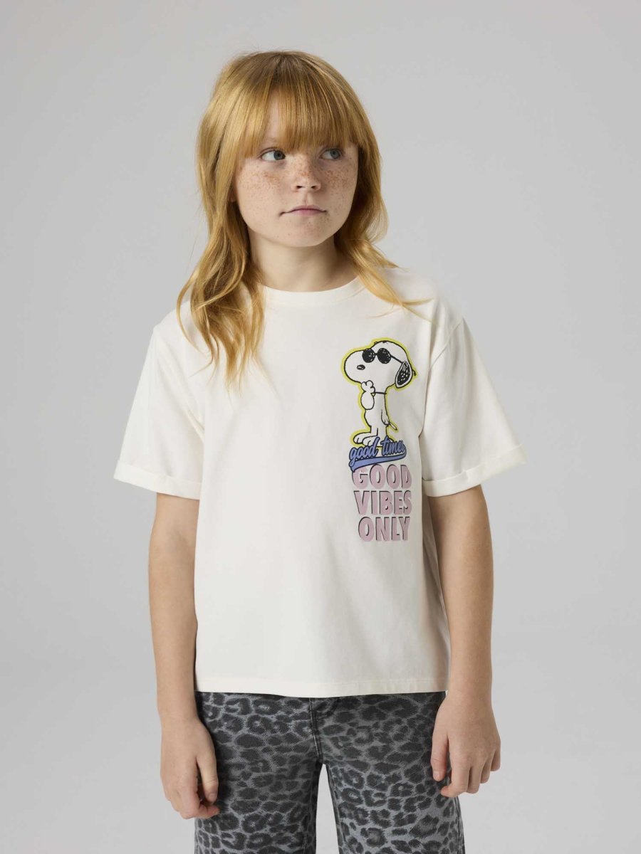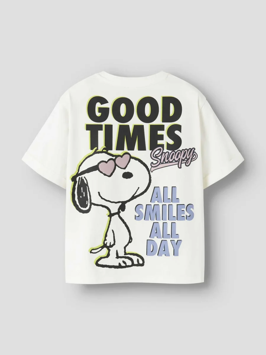 Name It T-shirt 13252116 Cloud – Questa t-shirt unisex presenta un design unico con la stampa di Snoopy che indossa occhiali da sole e le scritte ‘good times’ e ‘GOOD VIBES ONLY’ su entrambi i lati.