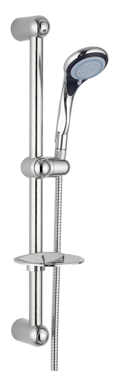 Anticalcare, doccetta in ABS cromato, funzioni pioggia-massaggio-spray-stop, asta in acciaio inox cm. 60, flessibile in acciaio inox da mt. 1,5, portasapone in ABS. NLNL