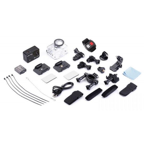 Custodia waterproof 30m, supporto manubrio, pacco batteria LiIon 1050mAh, aggancio rapido (x2), aggancio a vite, supporto 90° (x2), aggancio con vite fotografica, supporto 180°, supporto base piatta (x2), cavo USB, fascette, fascette di fissaggio, fascetta in metallo, pannetto per pulizia