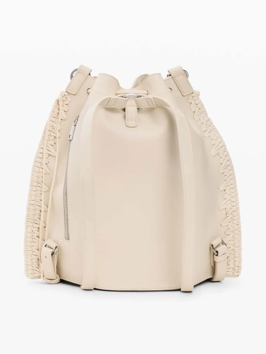 La chiusura superiore con coulisse regolabile garantisce praticità e sicurezza, mentre il manico lungo da spalla offre un’alternativa comoda e versatile al classico utilizzo da zaino. I dettagli metallici su tiretti e rinforzi aggiungono carattere e un accento moderno all’insieme.